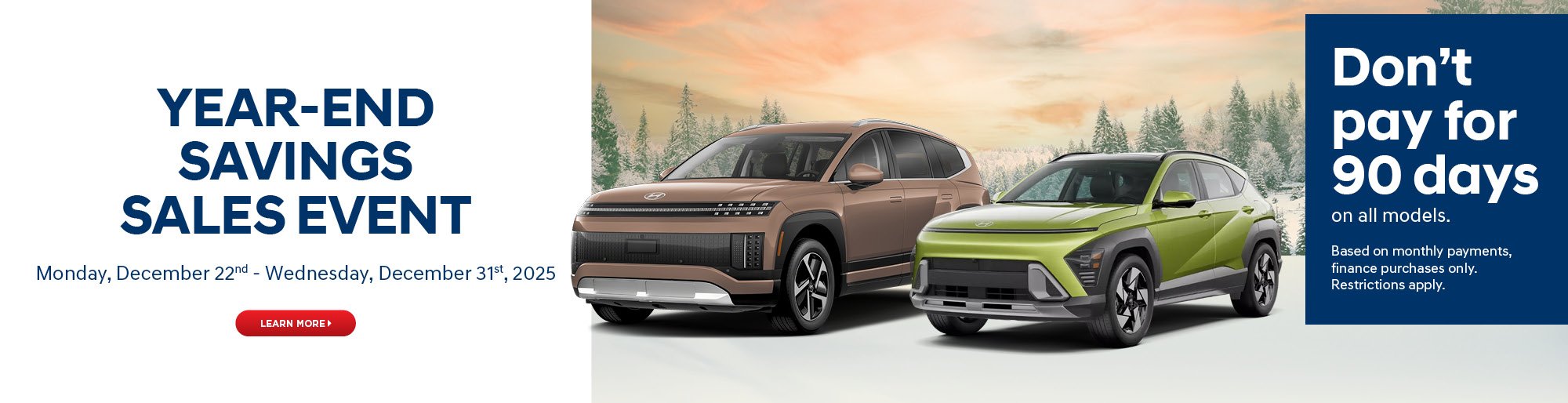 *0 payments (payment deferral) for 90 days is available on promotional finance offers of in-stock 2025/2026 Hyundai models. Payment deferral applies to only promotional finance offers on approved credit and proof of income may be required. If the payment deferral offer is selected, the original term of the finance contract will be extended by 2 months (60 days). Hyundai Auto Canada Corp. will pay the interest during the first 2 months (60 days) of the finance contract, after which the purchaser will pay all principal and interest owing in equal installments over the remaining term of the contract. Payments on finance contracts are paid in arrears. Down payments are not subject to the payment deferral offer and are due on the date the contract is signed. Hyundai Auto Canada Corp. reserves the right to amend or terminate this offer, in whole or in part, at any time without prior notice. Additional conditions and limitations apply. Ask your dealer for details. For finance contracts payable on a weekly and bi-weekly basis, purchasers who select the payment deferral offer may have to make their first weekly or bi-weekly payment sooner than 90 days from purchase. Additional $1,000 bonus applicable to select in-stock vehicles only. Model inventory for which price adjustments are applicable may vary from dealer to dealer and from region to region. Contact us for applicable model inventory. Offers expire January 2, 2026. Some conditions and restrictions may apply. Offers subject to change or cancellation without notice. Contact us for complete details.