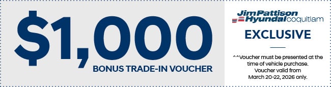 *0% finance rate applicable to new 2026 Kona Electric models for up to a 36-month term, on approved credit. †All current owners (and immediate family members with proof of residence at owner’s address) of a Hyundai or Genesis vehicle who present active (not expired) proof of ownership at time of purchase or lease are entitled to a lease rate reduction of 2%/1% on new 2026 Elantra & 2026 Tucson/all other models. Lease rate after 2% rate reduction cannot be less than 0%. Loyalty Incentive can be claimed once in total from owner and immediate family member at same address. **$16,000 savings applicable to 2025 IONIQ 6 Preferred RWD Long Range (Stock#: SA117542) only; offer includes $11,000 Hyundai Rebate and $5,000 Electric Vehicle Affordability Program (EVAP) incentive. (For more details: https://tc.canada.ca/en/road-transportation/innovative-technologies/zero-emission-vehicles/electric-vehicle-affordability-program-evap). ^$8,000 savings applicable to select new 2026 Kona Electric models and demo 2025 Hyundai Santa Fe Ultimate Calligraphy AWD (Stock #: D-SH136083) only. ^^Voucher must be presented at the time of vehicle purchase. Offers valid March 20-22, 2026 only. Some conditions and restrictions may apply. Offers subject to change or cancellation without notice. Contact Jim Pattison Hyundai Coquitlam for complete details.